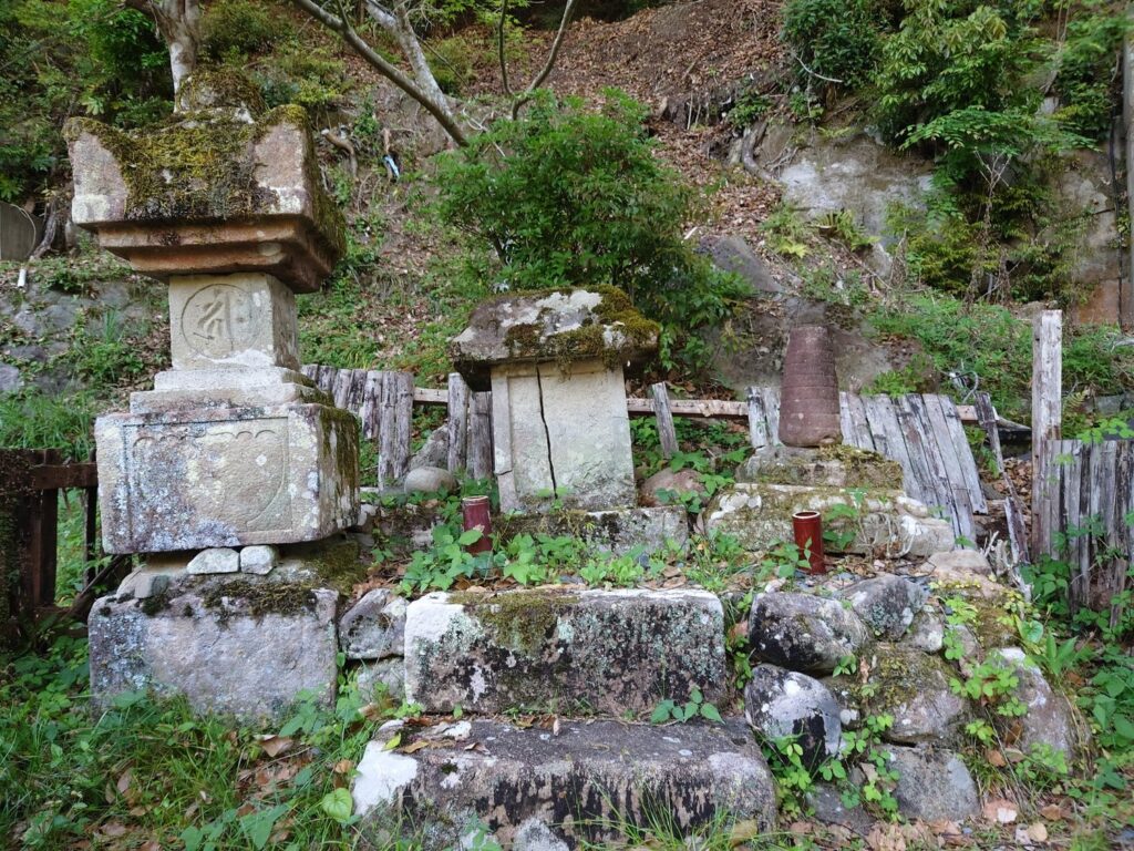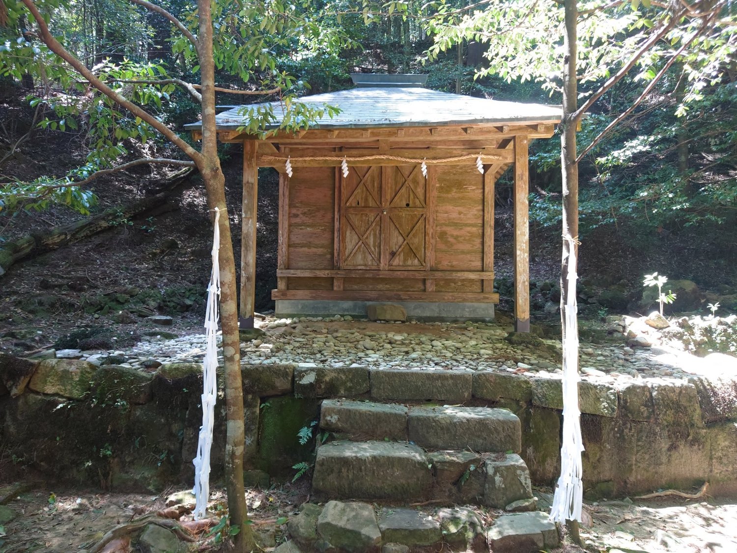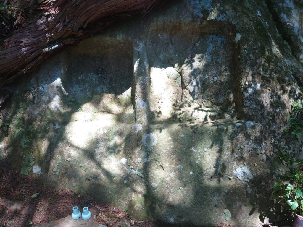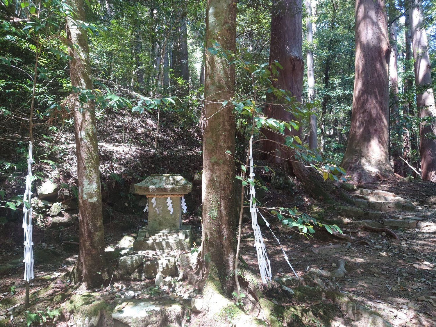 中辺路のよく整備された道とは大違いの完全なる山道です。CMで見る熊野古道をイメージしてるとひどい目に合いそう。根を上げたくなる程の急な上り坂、しかも悪路。それでもトレッキングポールがある分、だいぶ助かりました。相方は坂道でいつも文句をいう人なので、始終ヒーヒー言い続けます。途中途中に小さな社がありました。