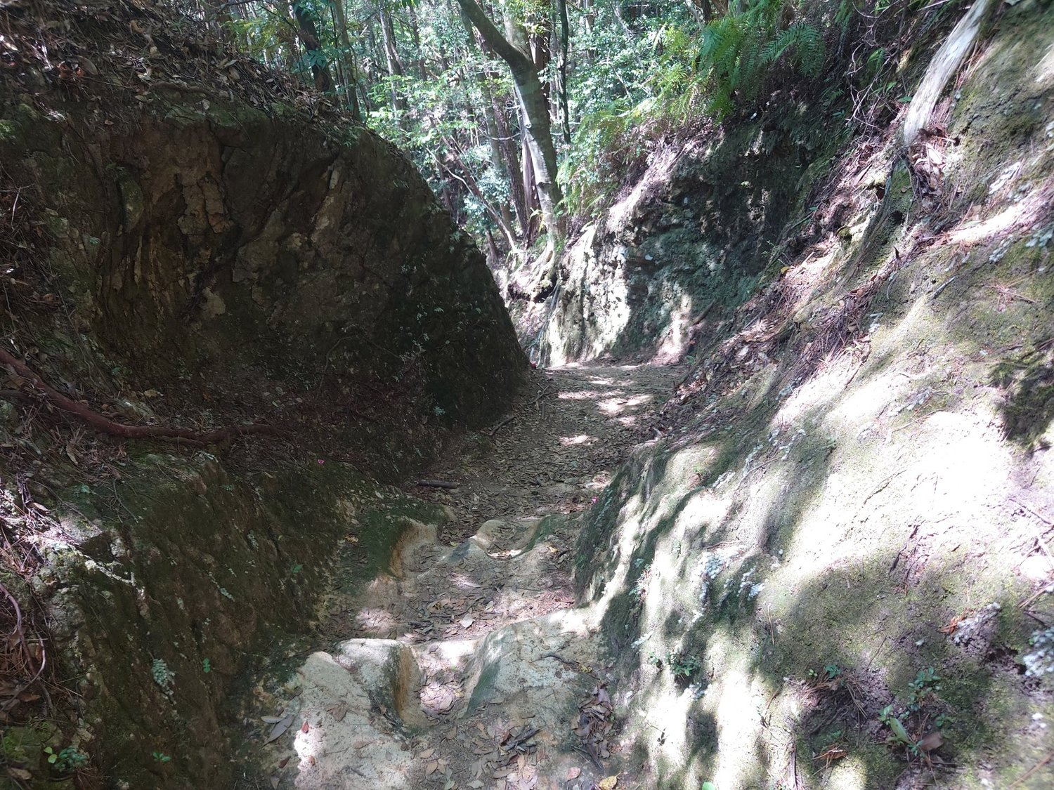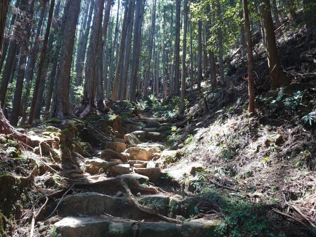 峠を越えて、あとは湯の峰温泉まで急な下り坂です。岩を削って作ったような人一人分しかない道に先人たちの足跡が残ります。