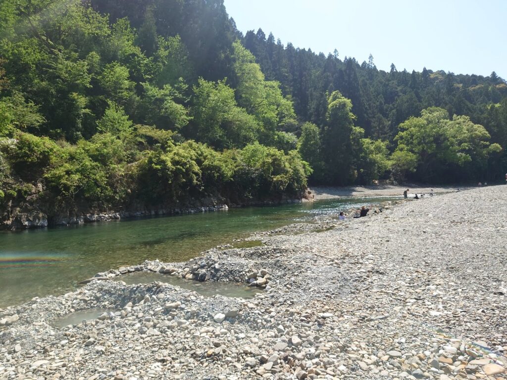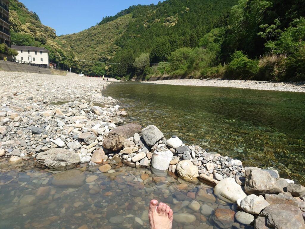 川っぺりを掘ると熱水が出ます。川の冷たい水を引き込んで、程よい温度になっているところを探して足を浸します。むくんだ足がほぐれました。