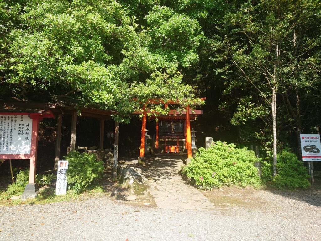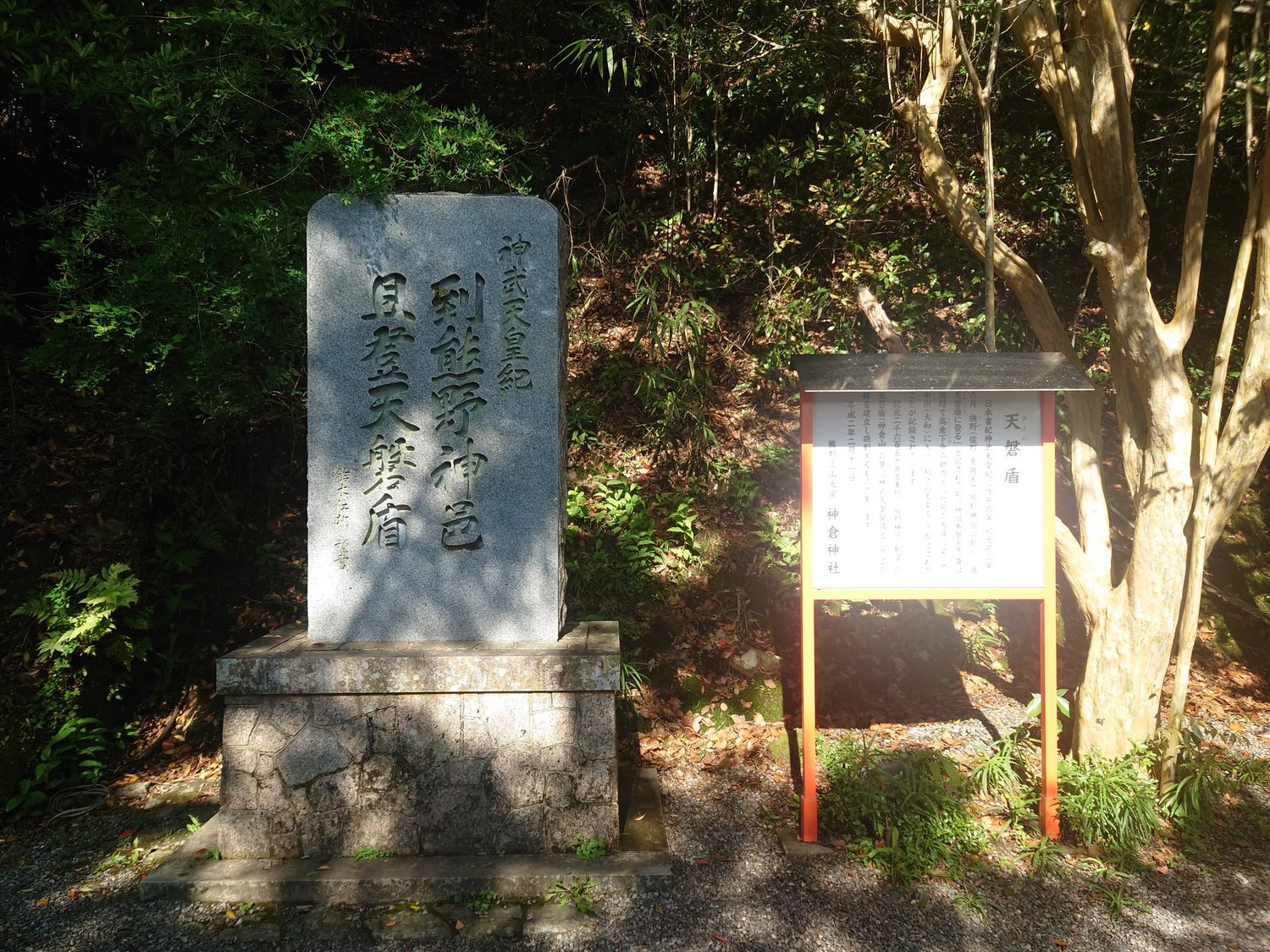 熊野速玉大社と同じく神橋があります。太鼓橋を渡り神倉神社の境内に入ります。高倉神社は熊野速玉大社の摂社で、高倉下命と天照大神を祀っています。神倉山は、神武天皇が東征の際に登った天磐盾の山と伝承されています。天磐盾の碑がありました。