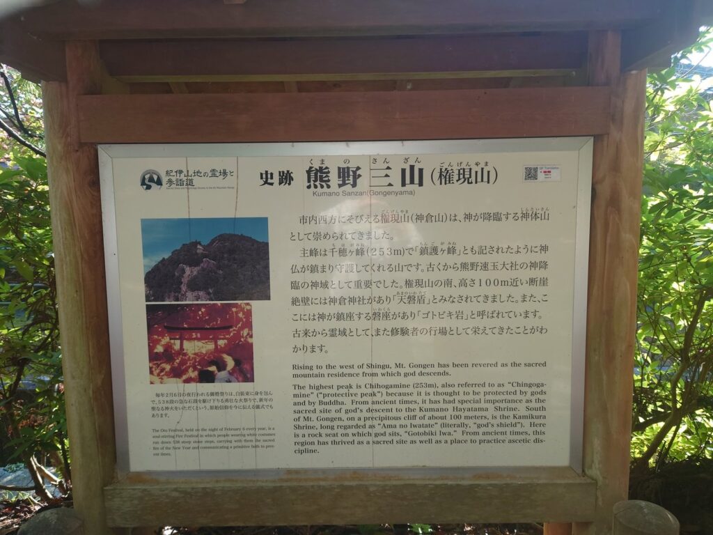 主峰は千穂ヶ峰(253m)で「鎮護ヶ峰」とも記されたように神仏が鎮まり守護してくれる山です。古くから熊野速玉大社の神降臨の神域として重要でした。権現山の南、高さ100m近い断崖絶壁には神倉神社があり「天磐盾」とみなされてきました。また、ここには神が鎮座する磐座があり「ゴトビキ岩」と呼ばれています。 古来から霊域として、また修験者の行場として栄えてきたことがわかります。