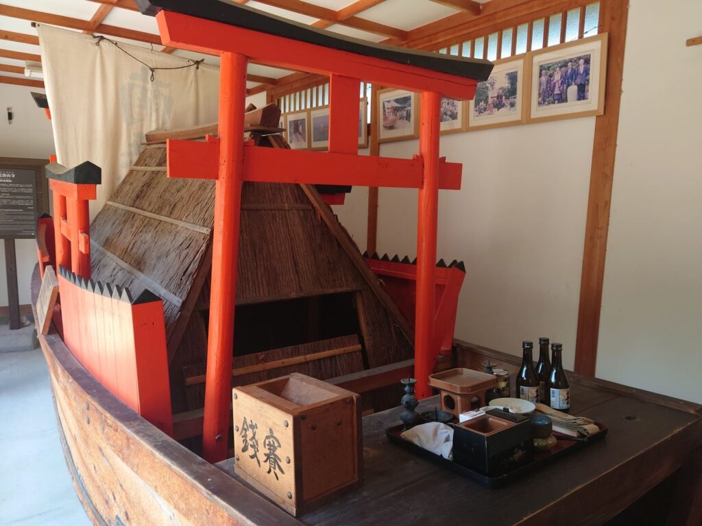 渡海船には、四つの鳥居に囲まれた人一人が納まる屋形が付いています。僧が入ると外から板を釘で打ち付けてしまうのだそうです。信仰心ゆえの死出の旅ですが、自然と無口になります。