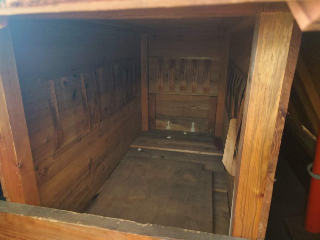 この船で最も目を引く特徴は、密閉された船室です。外側から釘でふさがれた窓も扉もない船室には、わずかな食料と水、灯りの燃料が入れられ、僧侶が死の直前まで経を唱え、観音菩薩に祈り続けられるようになっていました。