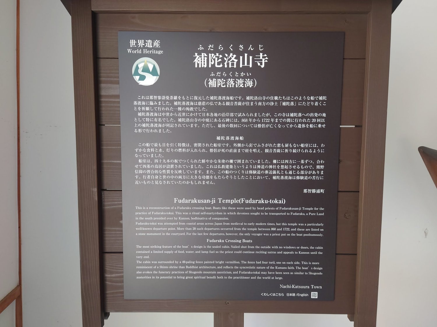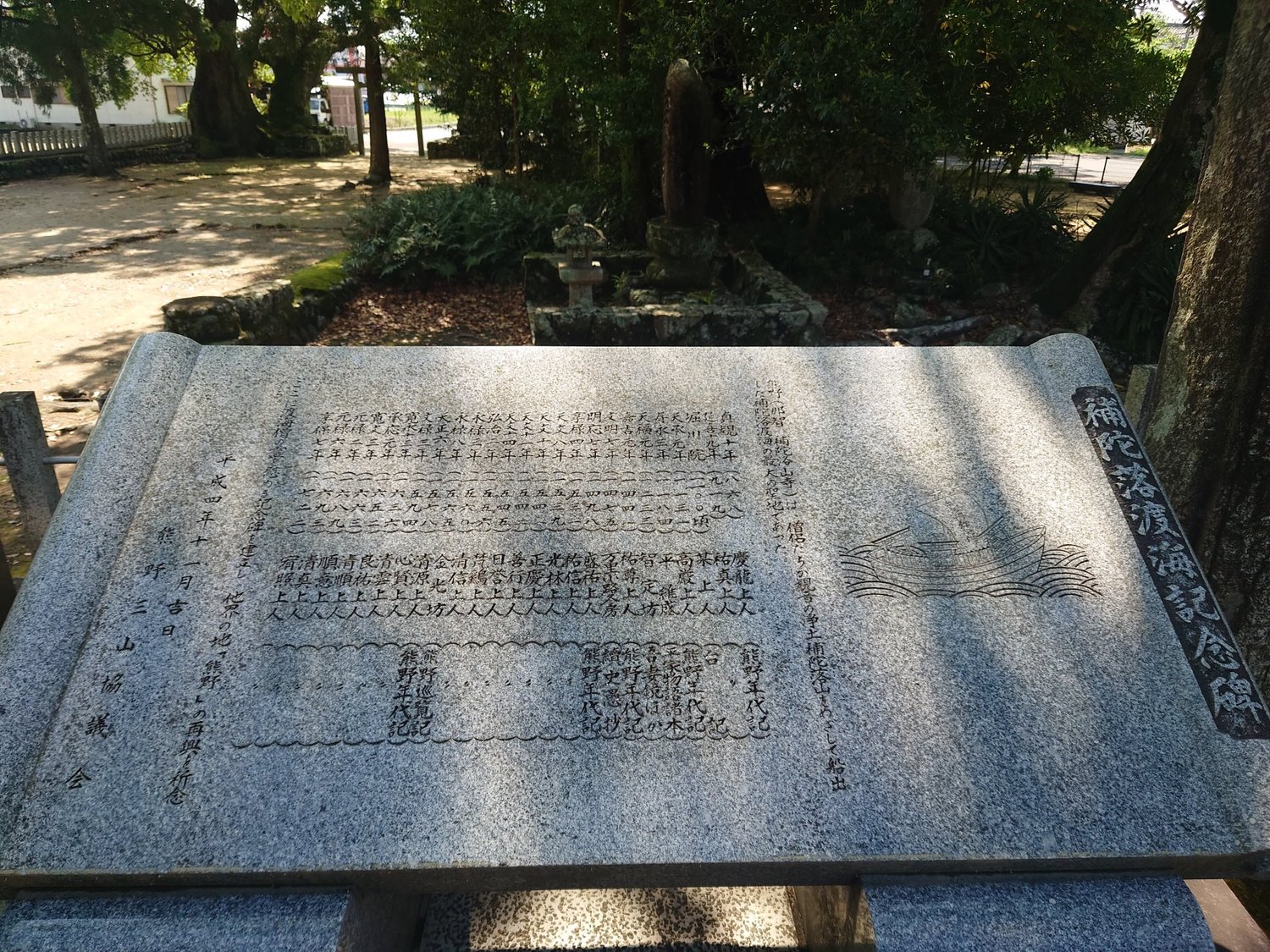 補陀落渡海は中世から近世にかけて日本各地の沿岸部で試みられましたが、この寺は補陀落への出発の地として特に有名でした。補陀洛山寺の中庭にある石碑には、868年から1722年までの間に行われた20回以上の補陀落渡海が列記されています。ただし、最後の数回については僧侶が亡くなってから遺体を船に乗せる形で行われました。補陀落渡海船