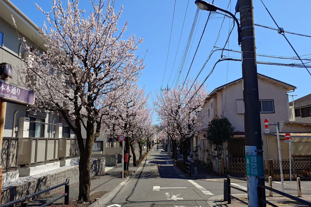 府中駅を離れ、歩いて美術館に向います。途中、三本木通りという細い道の並木が満開でした。早咲きの桜かと思ったら、杏でした。そう思ってよくよく見ると、枝一面に密度よく花が付く姿は、桜というより梅に似ています。